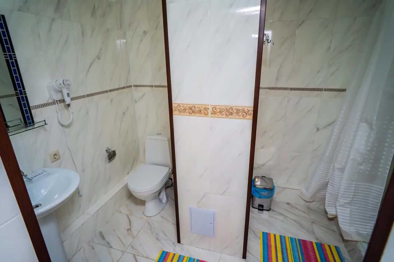 В номере две спальни, кухонный уголок со всей необходимой утварью для приготовления пищи. Основные спальные места — это две двухспальные кровати, и еще есть раскладной диван.
